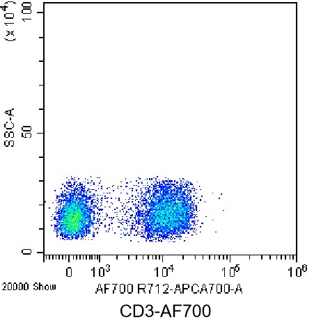 • Staining of splenic lymphocytes from C57BL/6 mice using AF700 Anti-Mouse CD3 Antibody (Clone: 17A2) (Product No.: G4642). Analyzed data are derived from live lymphocytes.