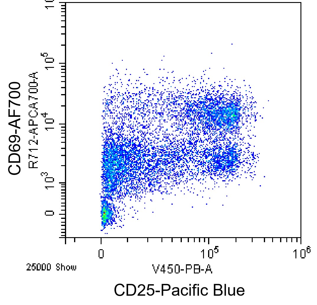 • Staining C57BL/6 spleen stimulated with Con A for three days with AF700 Mouse CD69 Antibody (Clone: H1.2F3) (Product Number: G0232) and PB CD25 Antibody. Analysis was performed on total live cells.