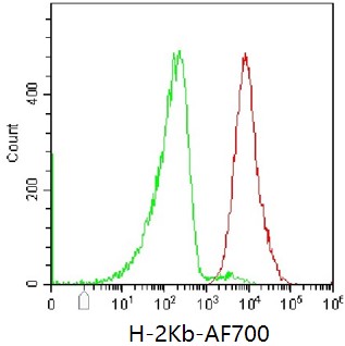 • Staining of splenic lymphocytes from C57BL/10 mice using AF700 Anti-Mouse H-2Kb Antibody (Clone: AF6-88.5) (Product No.: G1807) (red, green is blank control). Analyzed data are derived from live lymphocytes.