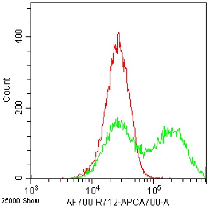 • Staining of fixed/permeabilized HEK-293F cell line cells transfected with pCMV-Il10(mouse)-3×FLAG-Neo plasmid (green) using AF700 Mouse IL-10 Antibody (Clone: JES5-16E3) (Catalog Number: G0787) and blank control (red). Analysis data derived from total cells.