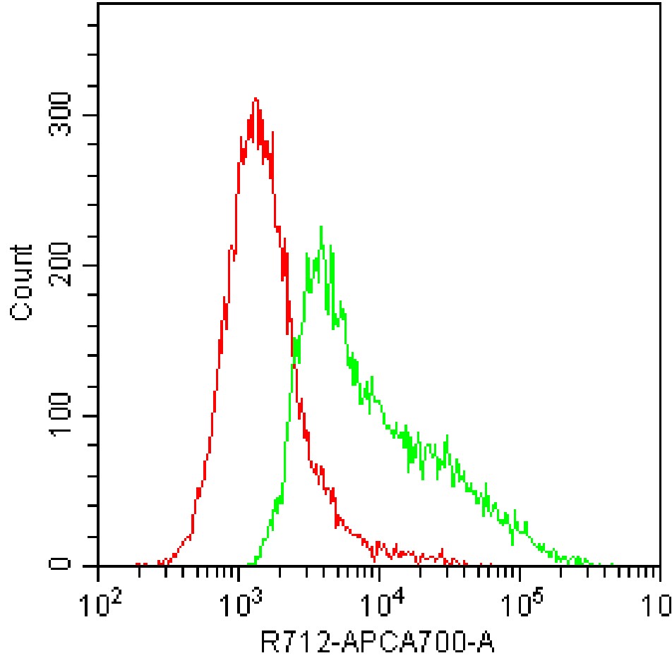 • Staining HEK-293F cells transfected with pCMV-Il2rb(mouse)-3×FLAG-Neo plasmid and fixed/permeabilized with fixation/permeabilization buffer with AF700 Mouse IL-2 Antibody (Clone: JES6-5H4) (Product Number: G1072) (green, red is unstained control). Analysis was performed on total cells.