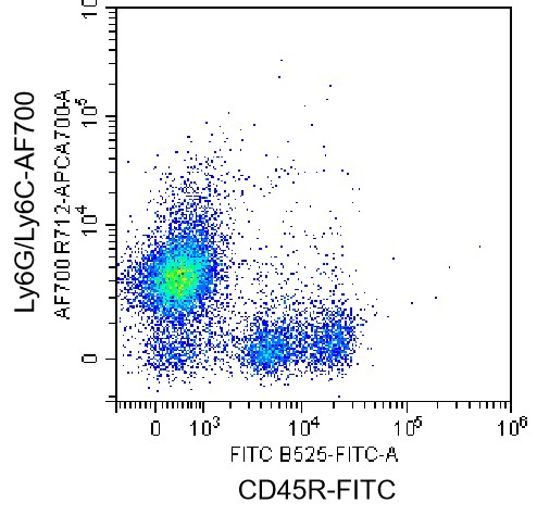 • Staining of bone marrow cells from C57BL/6 mice using FITC Anti-CD45R Antibody and AF700 Anti-Mouse Ly6G/Ly6C Antibody (Clone: RB6-8C5) (Product No.: G4342). Analyzed data are derived from live lymphocytes.