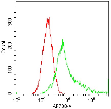 • Staining of permeabilized HEK-293F cells transfected with pLV3-CMV-Tnf(mouse)-CopGFP-Puro plasmid using fixation/permeabilization buffer with AF700 anti-mouse TNF-α Antibody (Clone: MP6-XT22) (Selleck Cat.No: G0337) (green, red is unstained control). Analysis data derived from total cells.