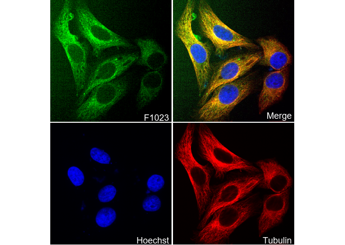 • Immunofluorescent analysis of HepG2 cells using F1023 (green, 1:100), Hoechst (blue) and tubulin (Red).