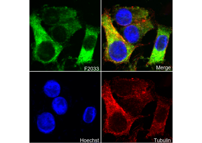 • Immunofluorescent analysis of MCF7 cells using F2033 (green, 1:100), Hoechst (blue) and tubulin (Red).