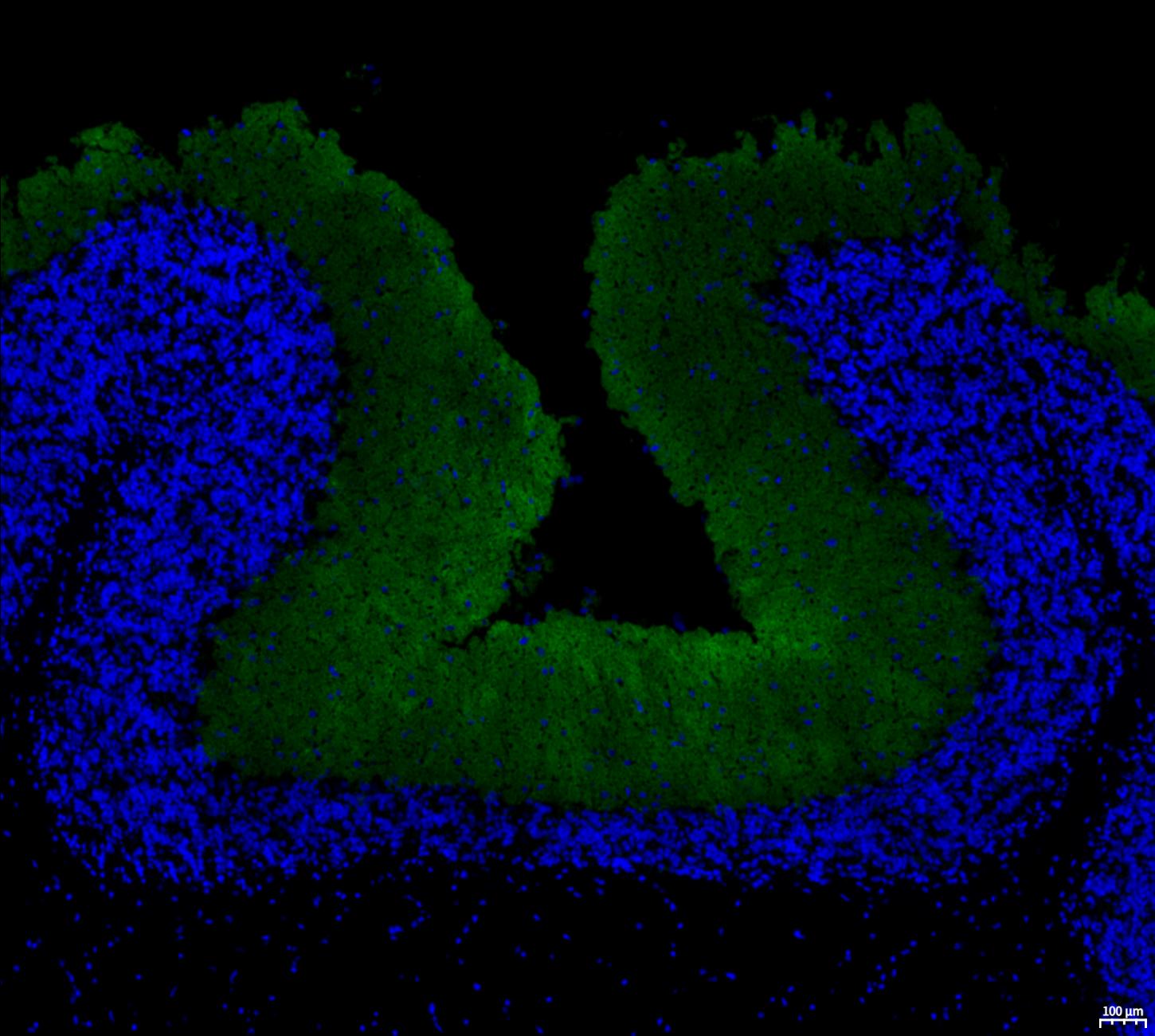 • Immunofluorescent analysis of Mouse cerebellum tissue using F1450 (green, 1:400) and Hoechst (blue).