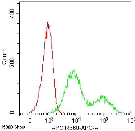 • Staining of fixed/permeabilized HEK-293F cells transfected with pCMV-TNFRSF10B(human)-3×FLAG-Neo plasmid using APC Anti-CD262/DR5 Antibody (Clone: DJR2-4 (7-8)) (Product No.: H2958) (green, red is blank control). Analyzed data are derived from total cells.