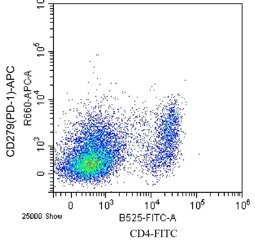 • Staining C57BL/6 mouse splenocytes stimulated for 3 days with Dynabeads™ Mouse T-Activator CD3/CD28 for T cell activation/expansion with APC CD279/PD-1 Antibody (Clone: J43) (Product Number: G0423) and CD4-FITC. Analysis was performed on total live cells.