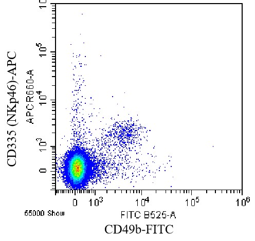 • Surface staining of C57BL/6 mouse spleen cells with FITC anti-mouse CD49b Antibody and APC anti-mouse CD335/NKp46 Antibody (Clone: 29A1.4) (Product Code: H3063). Analysis data derived from total live cells.