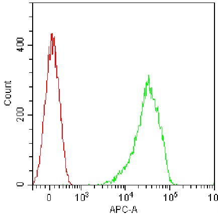 • Staining of normal human peripheral blood mononuclear cells (PBMCs) pre-blocked with human FcR blocking reagent with APC anti-human CD46 Antibody (Clone: MEM-258) (Product Code: H3033) (green, red is unstained control). Analysis data derived from lymphocytes.