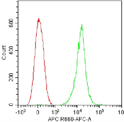 • Staining of normal human peripheral blood mononuclear cells (PBMCs) using APC CD47 Antibody (Clone: B6H12) (Product No.: H1428) (Green, Red: Blank Control). Analyzed data are derived from lymphocytes.