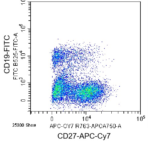 • Staining of normal human peripheral blood mononuclear cells (PBMCs) using FITC Anti-CD19 Antibody and APC-cy7 Anti-CD27 Antibody (Clone: O323) (Product No.: H0171). Analyzed data are derived from lymphocytes.
