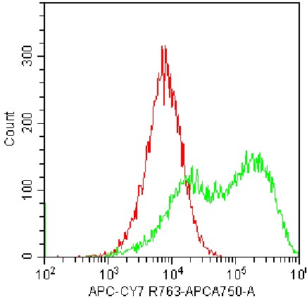 • Staining of fixed/permeabilized HEK-293F cells transfected with human CD273 plasmid using APC-Cy7 CD273 Antibody (Clone: MIH18) (Product No.: H1341) (Green, Red: Blank Control). Analyzed data are derived from total cells.