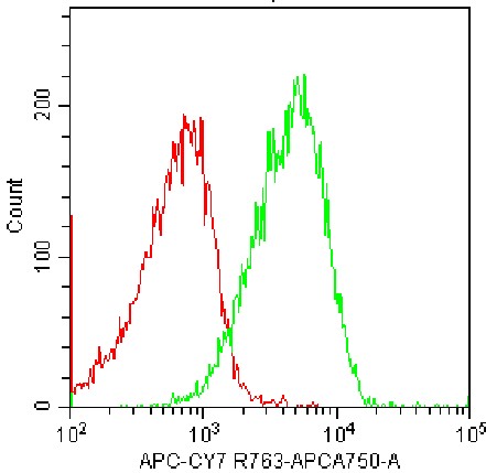 • Staining of fixed/permeabilized Jurkat cells using APC-Cy7 CXCR4 Antibody (Clone: UMB2) (Product No.: G4926) (Green, Red: Blank Control). Analyzed data are derived from total live cells.