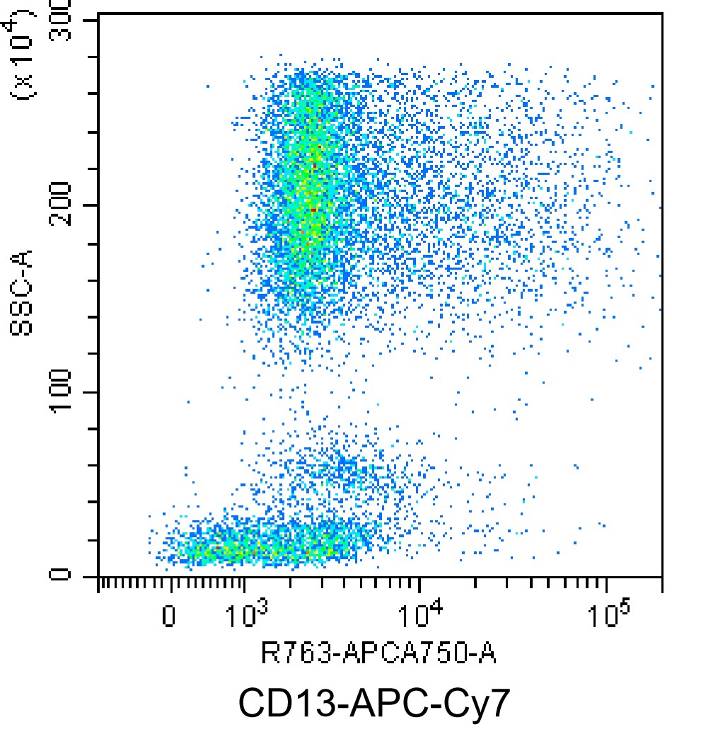 • Staining normal human peripheral blood with lysed red blood cells using ammonium chloride red blood cell lysis buffer with APC-Cy7 Human CD13 Antibody (Clone: WM15) (Product Number: H3336). Analysis was performed on total live cells.