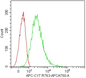 • Staining of HEK-293F cell line cells transfected with pEnCMV-TNFRSF9(human)-3×FLAG-WPRE-SV40-Neo plasmid and permeabilized using fixation/permeabilization buffer using APC-cy7 Anti-Human CD137 Antibody (Clone: 4B4-1) (Product No.: H3801) (Green, red is blank cells). Analyzed data are derived from total cells.