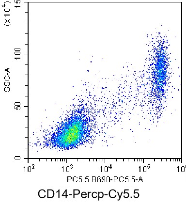 • Staining of normal human peripheral blood mononuclear cells (PBMCs) using APC-cy7 Anti-Human CD14 Antibody (Clone: M5E2) (Product No.: H0186). Analyzed data are derived from live cells.