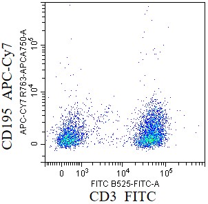 • Staining of normal human peripheral blood mononuclear cells (PBMCs) using FITC Anti-CD3 Antibody and APC-cy7 Anti-Human CD195 Antibody (Clone: 2D7/CCR5) (Product No.: H1026). Analyzed data are derived from lymphocytes.