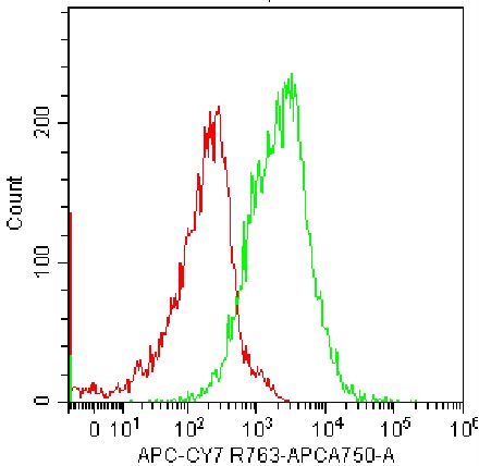 • Staining of normal human peripheral blood mononuclear cells (PBMCs) stimulated with Phytohemagglutinin (S6990) at a final concentration of 1ug/mL for 3 days using APC-cy7 Anti-Human CD25 Antibody (Clone: M-A251) (Product No.: H4251) (Green, Red: Blank Control). Analyzed data are derived from lymphocytes.