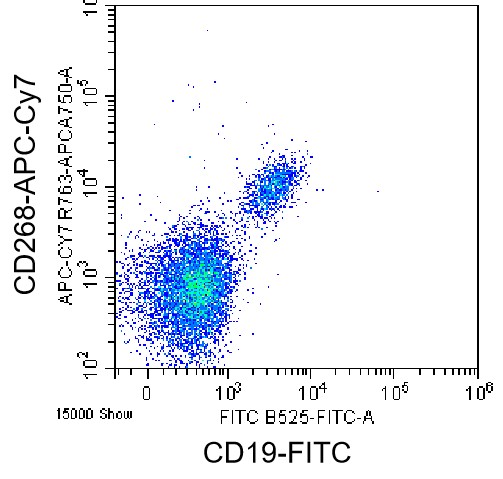 • Staining of normal human peripheral blood mononuclear cells (PBMCs) using FITC CD19 Antibody and APC-Cy7 Human CD268/BAFF-R Antibody (Clone: 11C1) (Catalog Number: H2166). Analysis data derived from lymphocytes.