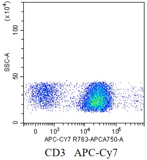 • Staining of normal human peripheral blood mononuclear cells (PBMCs) using APC-cy7 Anti-Human CD3 Antibody (Clone: OKT-3) (Product No.: H4281). Analyzed data are derived from lymphocytes.