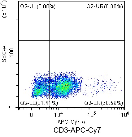 • Staining of normal human peripheral blood mononuclear cells (PBMCs) with APC-Cy7 anti-human CD3 Antibody (Clone: UCHT1) (Product Code: H4356). Analysis data derived from lymphocytes.