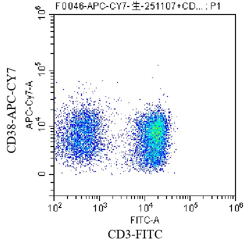 • Staining of normal human peripheral blood mononuclear cells (PBMCs) with FITC anti-human CD3 Antibody and APC-Cy7 anti-human CD38 Antibody (Clone: HIT2) (Product Code: H0861). Analysis data derived from lymphocytes.