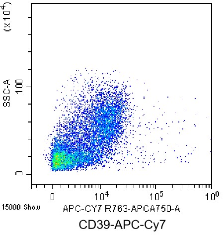 • Staining of normal human peripheral blood mononuclear cells (PBMCs) using APC-cy7 Anti-Human CD39 Antibody (Clone: A1) (Product No.: H3381). Analyzed data are derived from total cells.