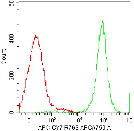 • Staining of normal human peripheral blood mononuclear cells (PBMCs) (green) using APC-Cy7 Human CD45 Antibody (Clone: HI30) (Catalog Number: H0096) and blank control (red). Analysis data derived from lymphocytes.