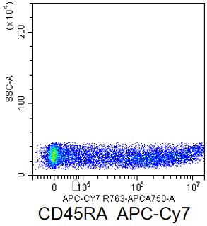 • Staining of normal human peripheral blood mononuclear cells (PBMCs) using APC-cy7 Anti-Human CD45RA Antibody (Clone: HI100) (Product No.: H0741). Analyzed data are derived from lymphocytes.