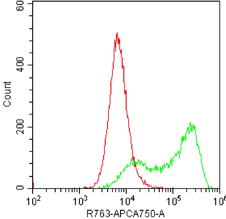• Staining normal human peripheral blood mononuclear cells (PBMCs) stimulated overnight with 5μg/mL PHA with FITC CD3 Antibody and APC-Cy7 Human CD69 Antibody (Clone: FN50) (Product Number: H0276) (green, red is unstained control). Analysis was performed on lymphocytes.
