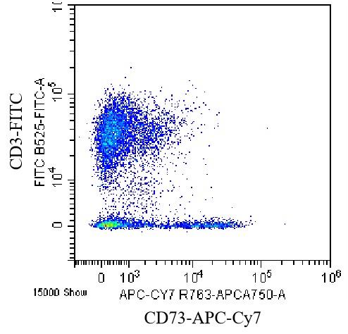 • Staining of normal human peripheral blood mononuclear cells (PBMCs) using FITC Anti-CD3 Antibody and APC-cy7 Anti-Human CD73 Antibody (Clone: AD2) (Product No.: H0366). Analyzed data are derived from lymphocytes.