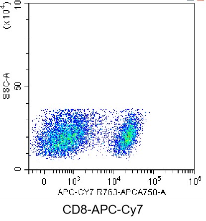 • Staining of normal human peripheral blood mononuclear cells (PBMCs) using APC-cy7 Anti-Human CD8 Antibody (Clone: SK1) (Product No.: H0546). Analyzed data are derived from lymphocytes.
