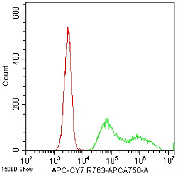• Staining of fixed/permeabilized HEK-298F cells transfected with pCMV-CD83(human)-3×FLAG-Neo plasmid using APC-cy7 Anti-Human CD83 Antibody (Clone: HB15e) (Product No.: H1476) (green, red is blank control). Analyzed data are derived from total cells.