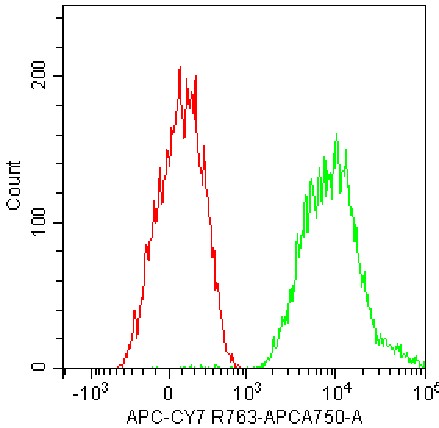 • Staging of HLA-A2 positive normal human peripheral blood mononuclear cells (PBMCs) using APC-cy7 Anti-Human HLA-A2 Antibody (Clone: BB7.2) (Product No.: H1791) (green, red is blank control). Analyzed data are derived from monocytes.