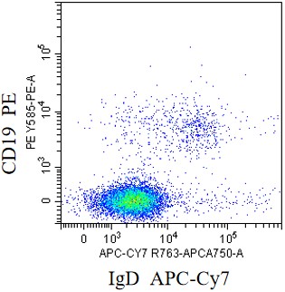 • Staining of normal human peripheral blood mononuclear cells (PBMCs) using PE Anti-CD19 Antibody and APC-cy7 Anti-Human IgD Antibody (Clone: IA6-2) (Product No.: H3696). Analyzed data are derived from lymphocytes.