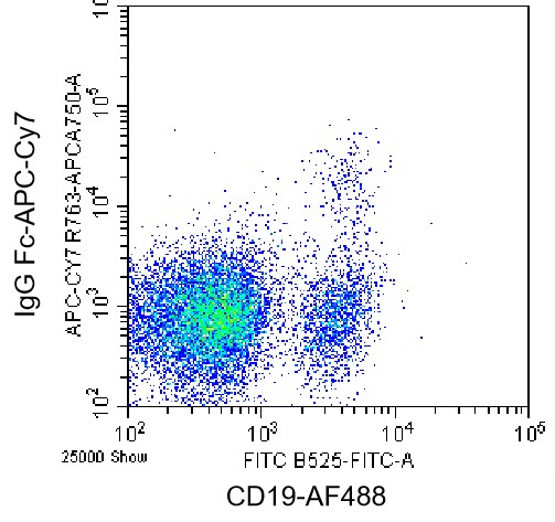 • Staining of normal human peripheral blood mononuclear cells (PBMCs) using AF488 CD19 Antibody and APC-Cy7 Human IgG Fc Antibody (Clone: M1310G05) (Catalog Number: H2271). Analysis data derived from lymphocytes.
