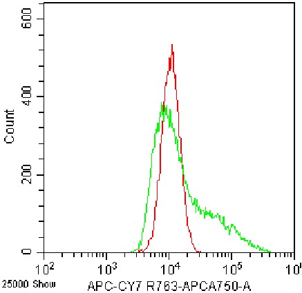 • Staining of fixed/permeabilized HEK-293F cells transfected with Human, IFN gamma cDNA ORF Clone, Flag plasmid using APC-cy7 Anti-IFN-gamma Antibody (Clone: 4S.B3) (Product No.: H0126) (Green, Red: Blank Control). Analyzed data are derived from total cells.