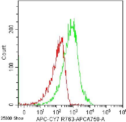 • Staining of C57BL/6 mouse splenic lymphocytes (green) using APC-Cy7 Mouse CD43 Activation-Associated Glycoform Antibody (Clone: 1B11) (Catalog Number: G1041) and blank control (red). Analysis data derived from live lymphocytes.