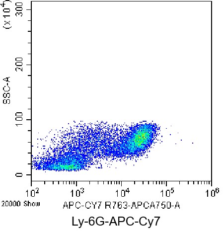 • Staining of bone marrow cells from C57BL/6 mice using APC-cy7 Anti-Mouse Ly6G Antibody (Clone: 1A8) (Product No.: G4431). Analyzed data are derived from live lymphocytes.