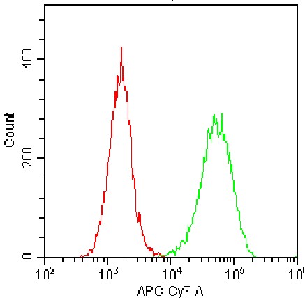 • Staining of J774A.1 cell line cells with APC-Cy7 anti-mouse Siglec-F Antibody (Clone: E50-2440) (Product Code: G0471) (green) and unstained control (red). Analysis data derived from live cells.