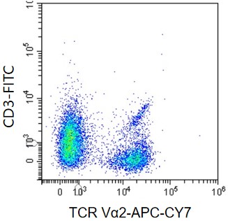 • Staining of splenic lymphocytes from C57BL/6 mice using FITC Anti-CD3 Antibody and APC-cy7 Anti-Mouse TCR Vα2 Antibody (Clone: B20.1) (Product No.: G1671). Analyzed data are derived from live lymphocytes.