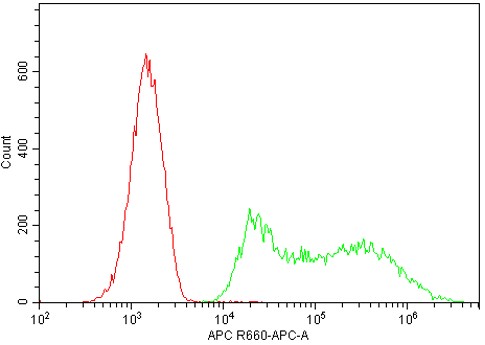 • Staining of fixed/permeabilized HEK-294F cells transfected with a plasmid containing a Flag tag using APC Anti-DYKDDDDK Tag Antibody (Clone: L5) (Product No.: G2178) (green, red is blank control). Analyzed data are derived from total cells.