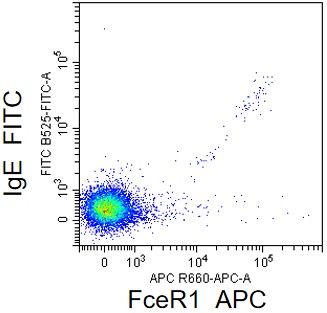 • Staining of normal human peripheral blood mononuclear cells (PBMCs) using FITC Anti-IgE Antibody and APC Anti-FCER1A Antibody (Clone: AER-37) (Product No.: H0768). Analyzed data are derived from lymphocytes.