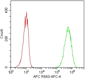 • Staining of fixed/permeabilized SKBR3 cell line cells using APC Anti-HER2/ErbB2 Antibody (Clone: 29D8) (Product No.: G3738) (green, red is blank control). Analyzed data are derived from total cells.