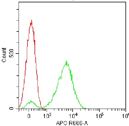 • Staining of U937 cells stimulated with GM-CSF and IFN-γ with APC anti-human HLA-G Antibody (Clone: 87G) (Product Code: H2748) (green, red is unstained control). Analysis data derived from total cells.