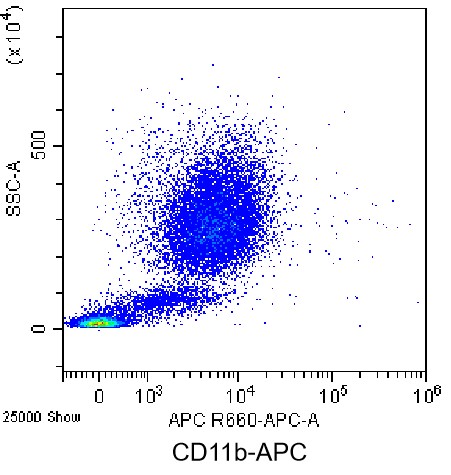 • Staining of normal human peripheral blood red blood cell-lysed using ammonium chloride lysis buffer using APC Anti-Human CD11b Antibody (Clone: CBRM1/5) (Product No.: H0078). Analyzed data are derived from total live cells.