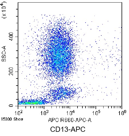 • Staining of normal human peripheral blood lysed with ammonium chloride red blood cell lysis buffer using APC Anti-Human CD13 Antibody (Clone: WM15) (Product No.: H3333). Analyzed data are derived from total live cells.