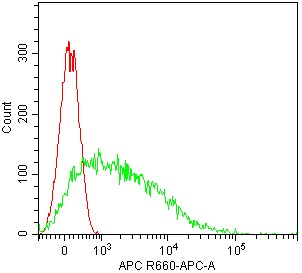 • Staining of HEK-293F cell line cells transfected with pEnCMV-TNFRSF9(human)-3×FLAG-WPRE-SV40-Neo plasmid and permeabilized using fixation/permeabilization buffer using APC Anti-Human CD137 Antibody (Clone: 4B4-1) (Product No.: H3798) (Green, red is blank cells). Analyzed data are derived from total cells.