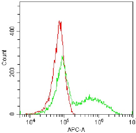 • Staining of permeabilized HEK-293F cells transfected with pCMV-PDGFRB(human)-3×HA-Neo plasmid using fixation/permeabilization buffer with APC anti-human CD140b Antibody (Clone: 18A2) (Product Code: H4053) (green, red is unstained control). Analysis data derived from total cells.